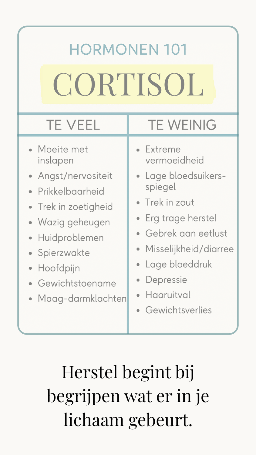 Wanneer je cortisol langdurig te hoog is geweest, raakt je systeem vaak uitgeput — waardoor je cortisol juist te laag kan worden. Dat is nog steeds een teken van een overbelast zenuwstelsel.