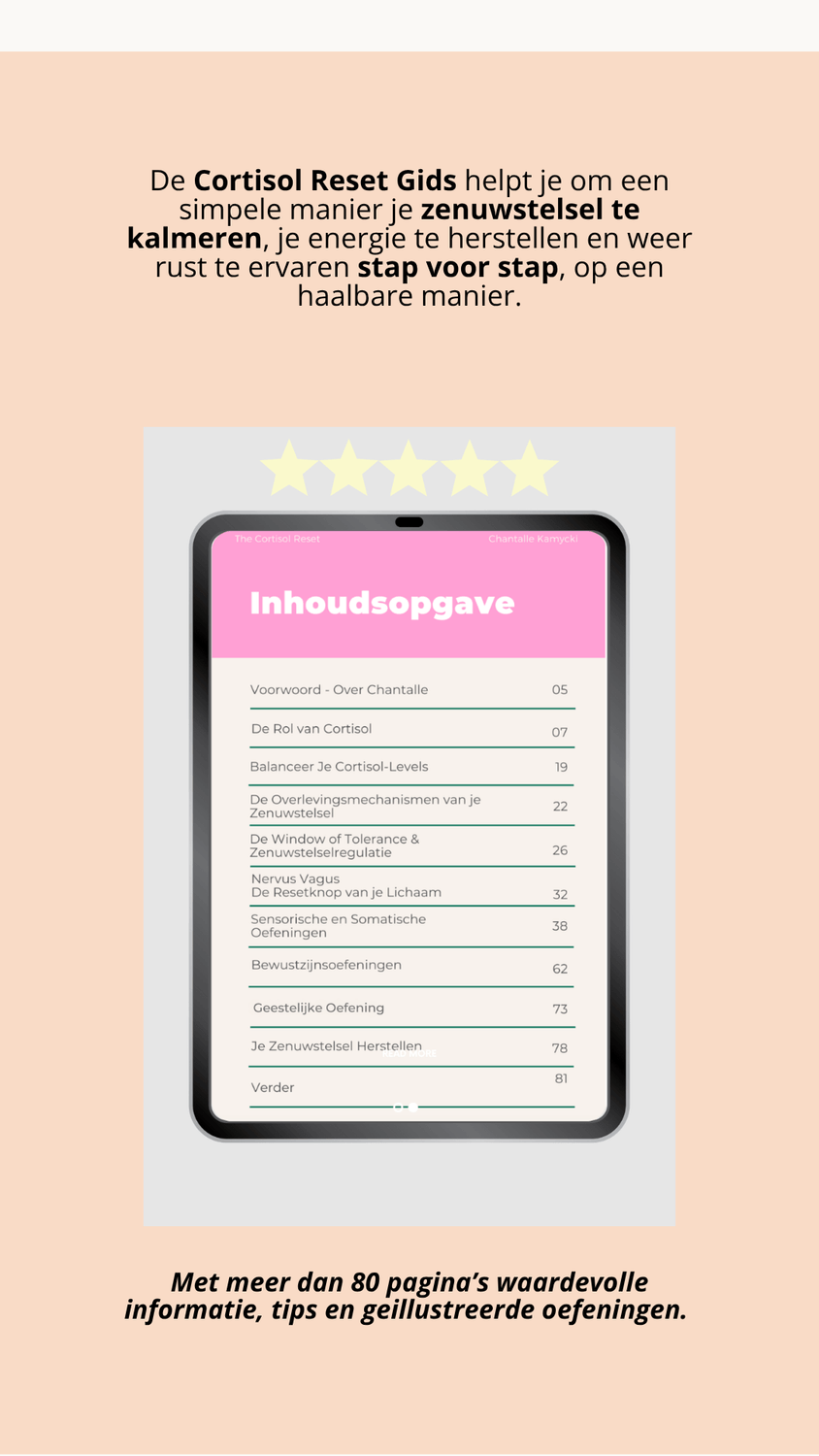 Je ontvangt direct toegang tot een praktische PDF van 80+ pagina’s met inzichten, tools en oefeningen om je cortisol en zenuwstelsel te resetten.