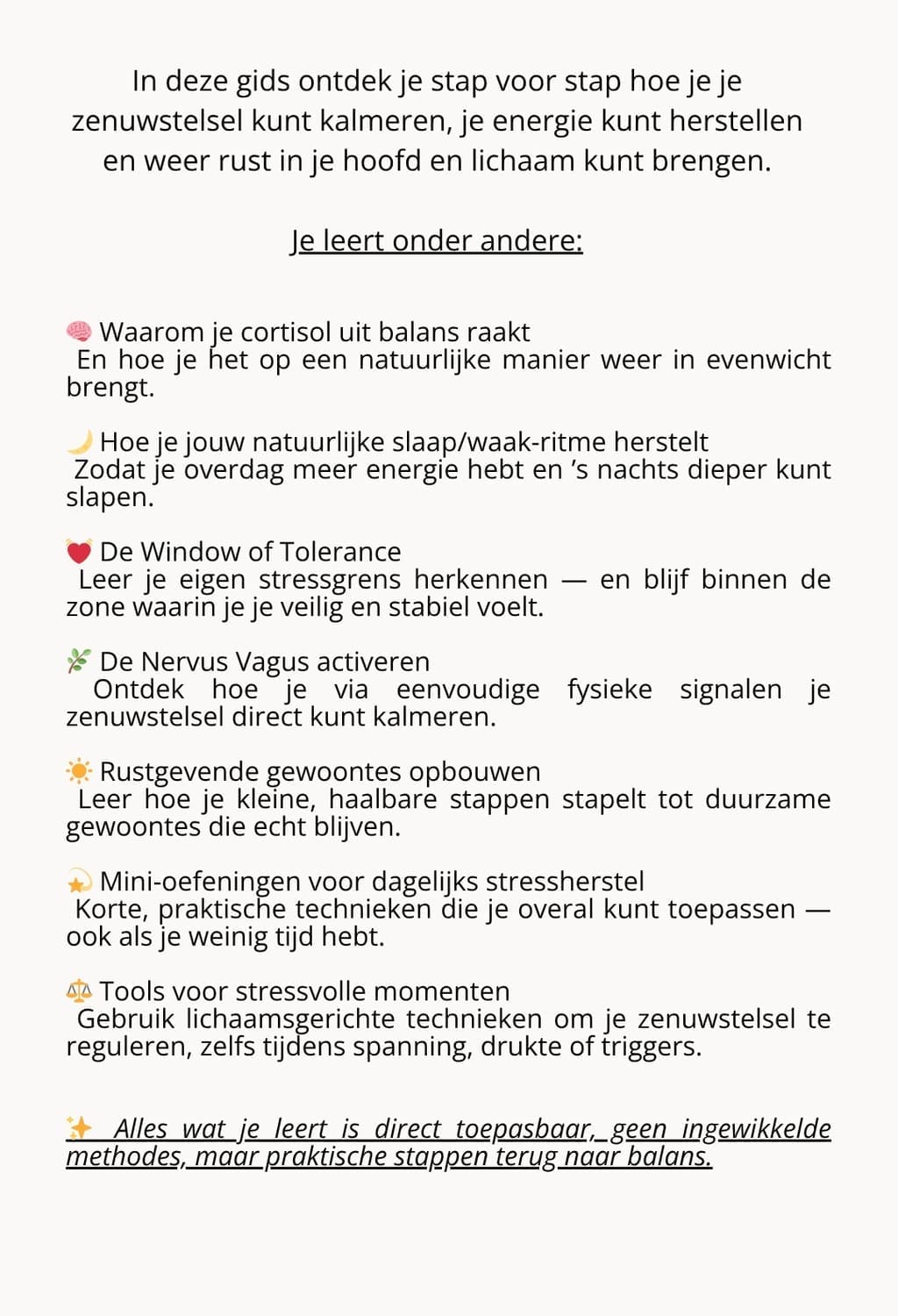 Deze gids helpt je om stap voor stap te herstellen, vertragen en je lichaam weer veilig te laten voelen, zodat je stresssysteem zich kan herstellen naar zijn natuurlijke balans.