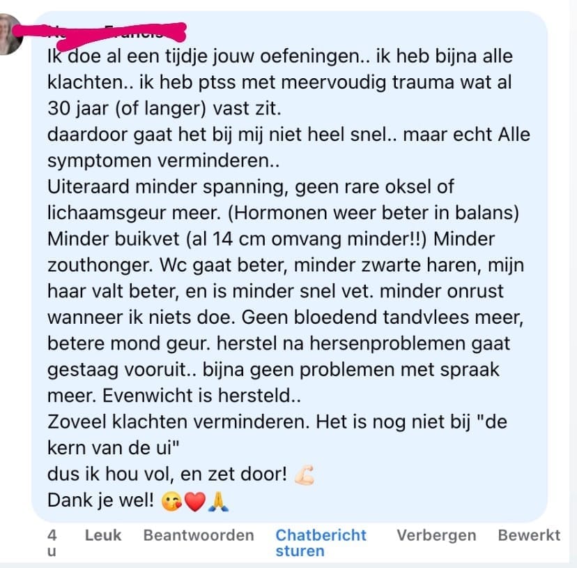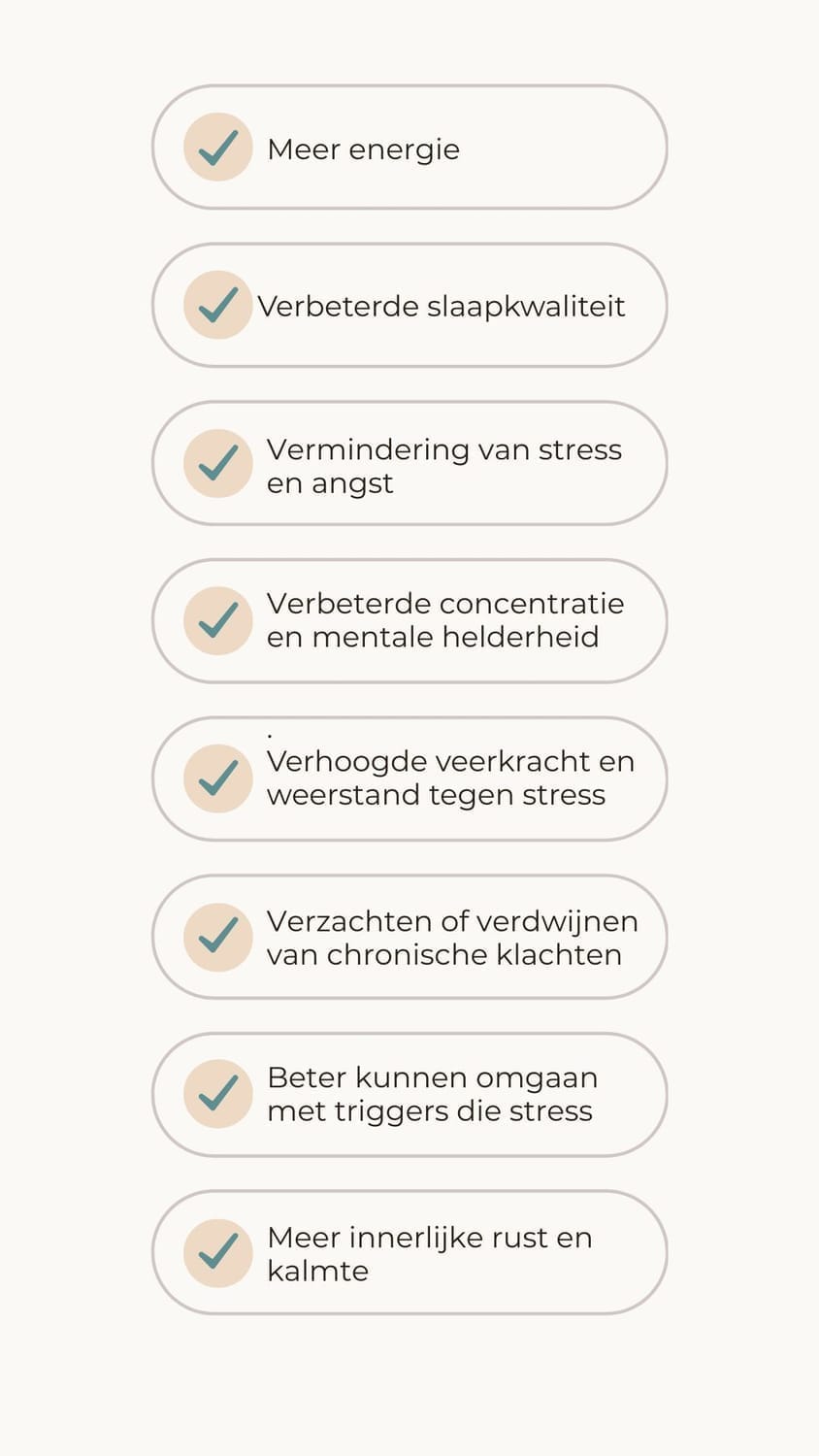 Zo verminder je stress, angst en spanning. Hierdoor ervaar je meer rust, veerkracht en vertrouwen in je lichaam.